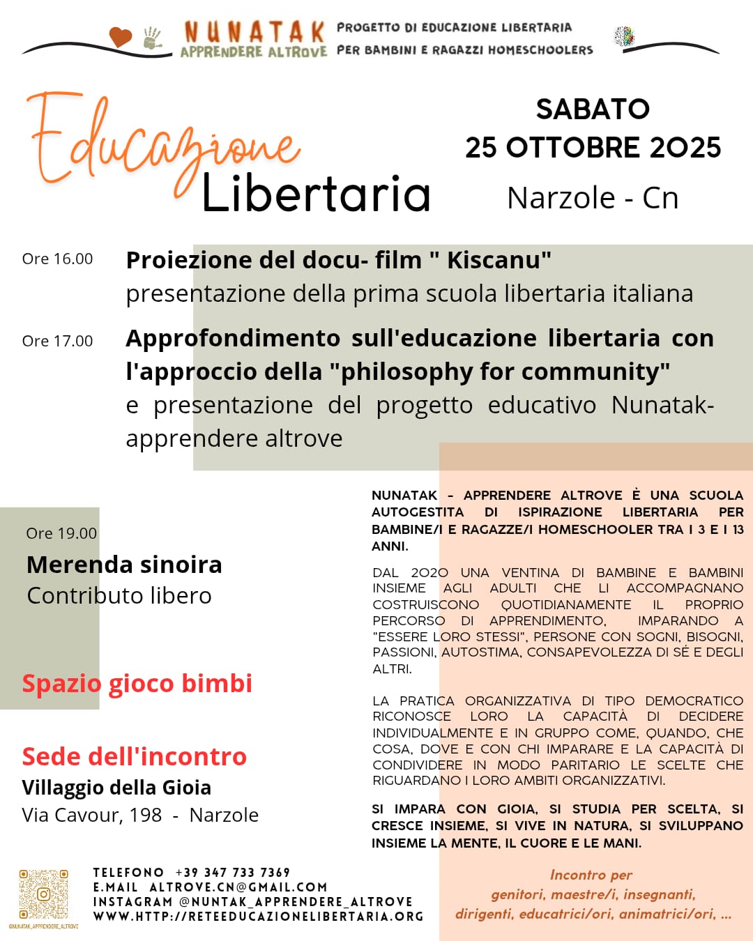 Educazione Libertaria Un pomeriggio per scoprire un modo speciale di imparare, crescere e vivere insieme. 🎬 Ore 16:00– Proiezione del docu-film “Kiscanu” La storia della prima scuola libertaria italiana. 💬 Ore 17:00– Approfondimento sull’educazione libertaria Con l’approccio “Philosophy for Community” e presentazione del progetto Nunatak – Apprendere Altrove. 🍞 Ore 19:00 – Merenda sinoira (contributo […]