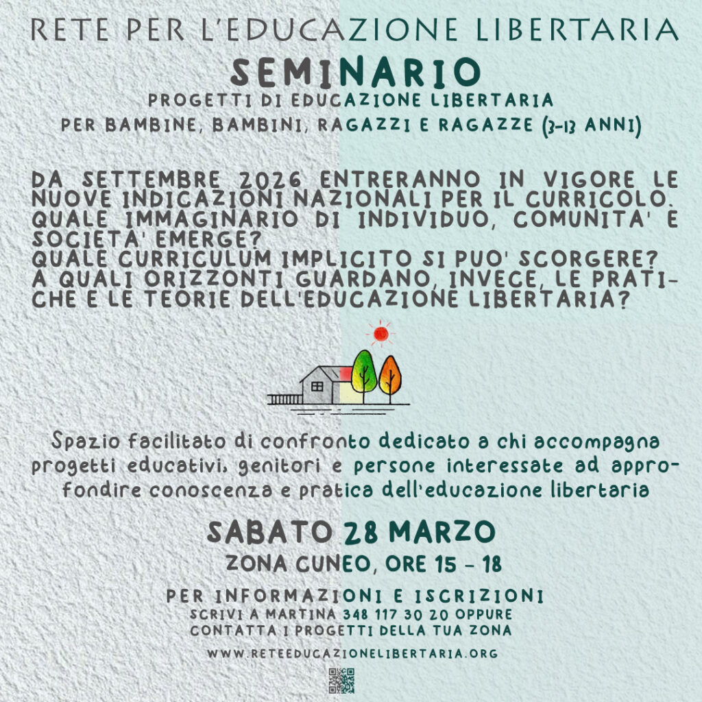 L’educazione libertaria è un insieme di principi ed esperienze unite ad una pratica organizzativa di tipo democratico che riconosce ai bambini e alle bambine, ai ragazzi e alle ragazze la capacità di decidere individualmente e in gruppo come, quando, che cosa, dove e con chi imparare e la capacità di condividere in modo paritario le scelte che riguardano i loro ambiti organizzativi. L’educazione libertaria fonda la relazione educativa adulto-bambino sul riconoscimento di tali capacità quali mezzi per lo sviluppo dell’autonomia e della libertà di scelta dei bambini. Il contesto da noi privilegiato per la messa in opera di principi e pratiche democratiche così intesi è la scuola.